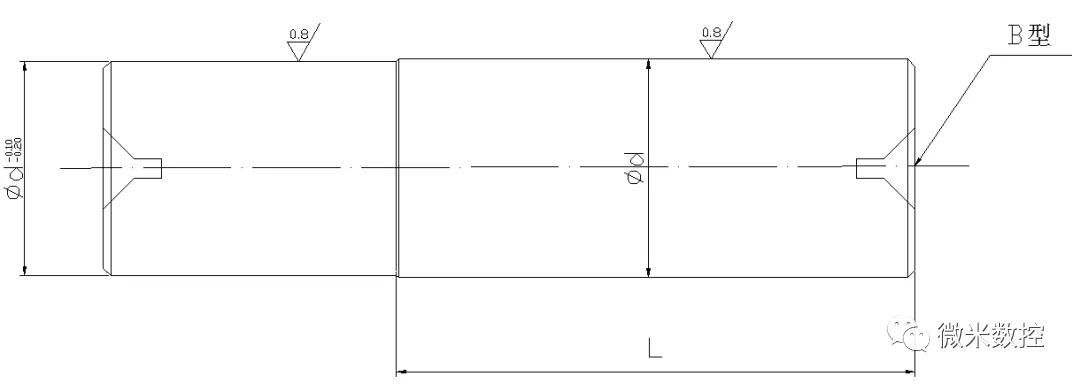 加工护轴毛胚用45﹟碳结构圆钢;车端面、开两头B型顶尖孔,粗车外圆,留余量1mm。经热处理调质定形、再精车留0.2mm余量研磨。重新热处理碎火表面,硬度HRC50,再经外圆磨床磨成如下图所示,精度达要求,完工后待用。